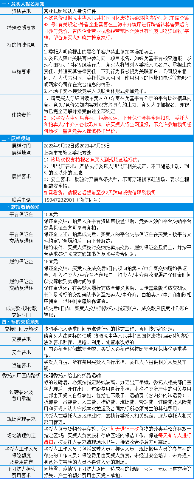 有意竞买者需开通中国兵器工业集团采购电子商务平台帐号进行报名及缴纳线上保证金。所竞价标的:PE废品废料,起拍价3.38元/千克;