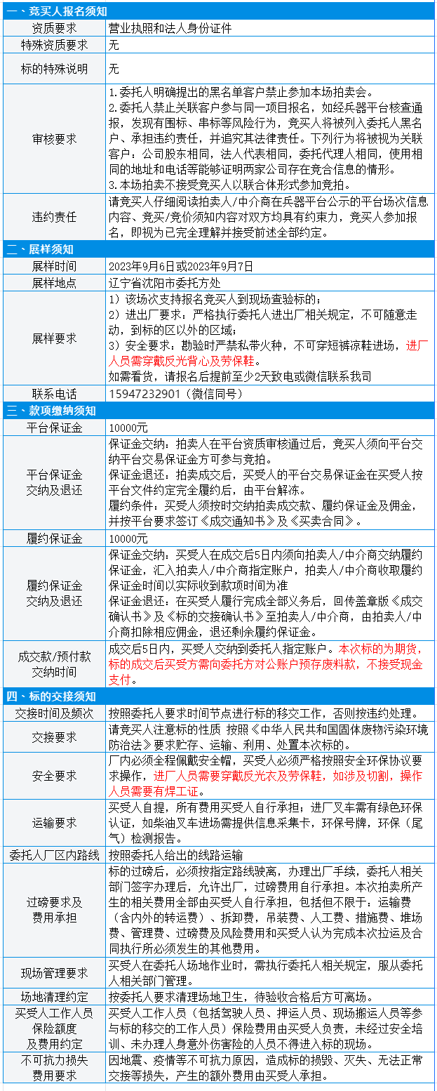 受企业委托,我公司定于2023年9月8日9:00-9:30在中国兵器工业集团采购电子商务平台(http://www.norincogroup-ebuy.com/)对废铁(边角料)(期货)进行公开网络竞价。
