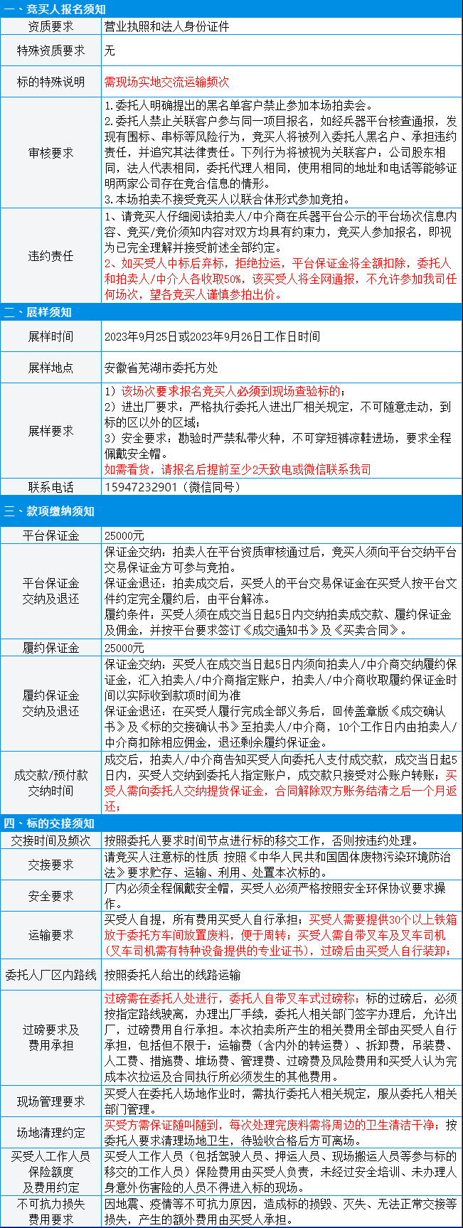 有意竞买者需开通中国兵器工业集团采购电子商务平台帐号进行报名及缴纳线上保证金。所竞价标的:废料(废镀锌板),起拍单价:2350元/吨(有保留价),预估重量100吨,标的质量及重量均以现场预展实物实际过磅为准,所提供标的简介、图片仅供参考。