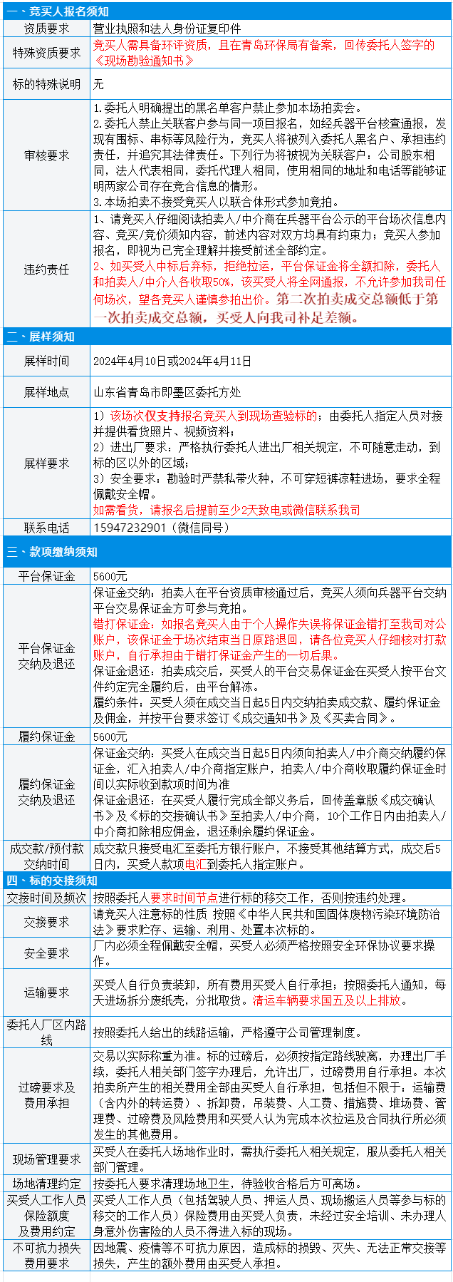 有意竞买者需开通中国兵器工业集团采购电子商务平台帐号进行报名及缴纳线上保证金。所竞价标的:废旧设备,起拍单价55000元/批,数量为1批。